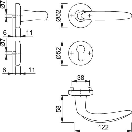 - Konstrukcja: klamki niezespolone z szyldem, uniwersalne sprężyny cofające lewa/prawa, bezobsługowe łożyska