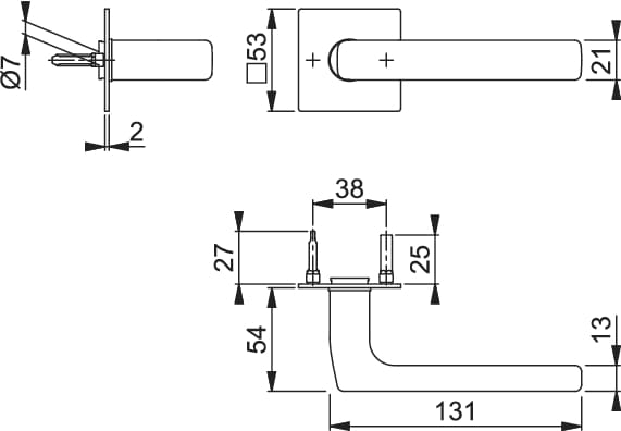 - Mocowanie: nakładane rozety klamki z przelotowo łączonymi czopami stabilizującymi