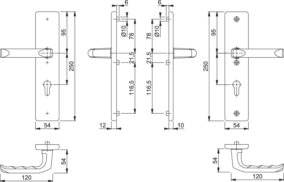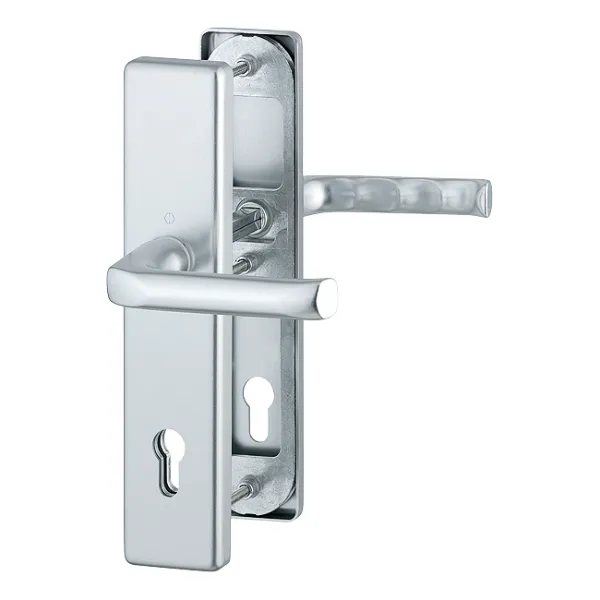 Komplet aluminiowych klamek ochronnych HOPPE na długim szyldzie do drzwi zewnętrznych lub drzwi wejściowych mieszkania:
